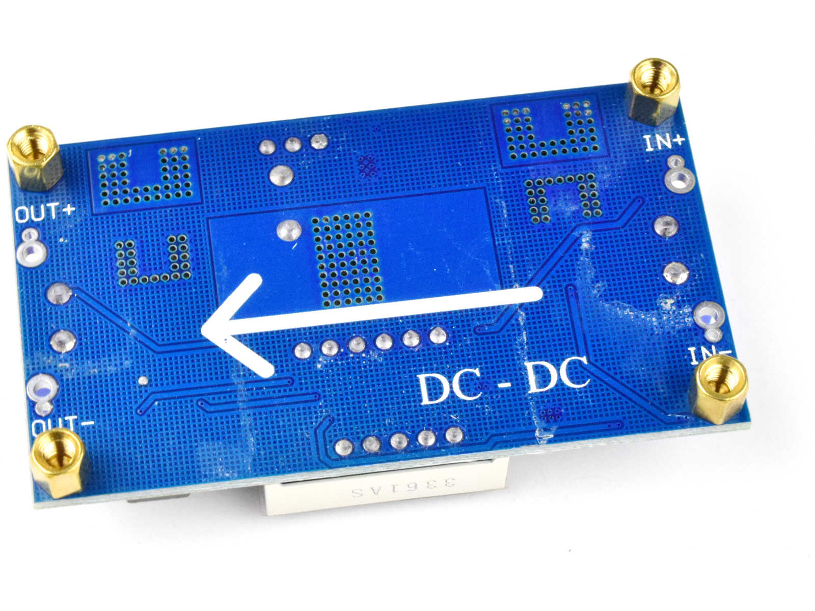 The output voltage can be adjusted by the on-board trimmer potentiometer. The input voltage must be at least 1.5V higher than the output voltage (>2V recommended for better stability).