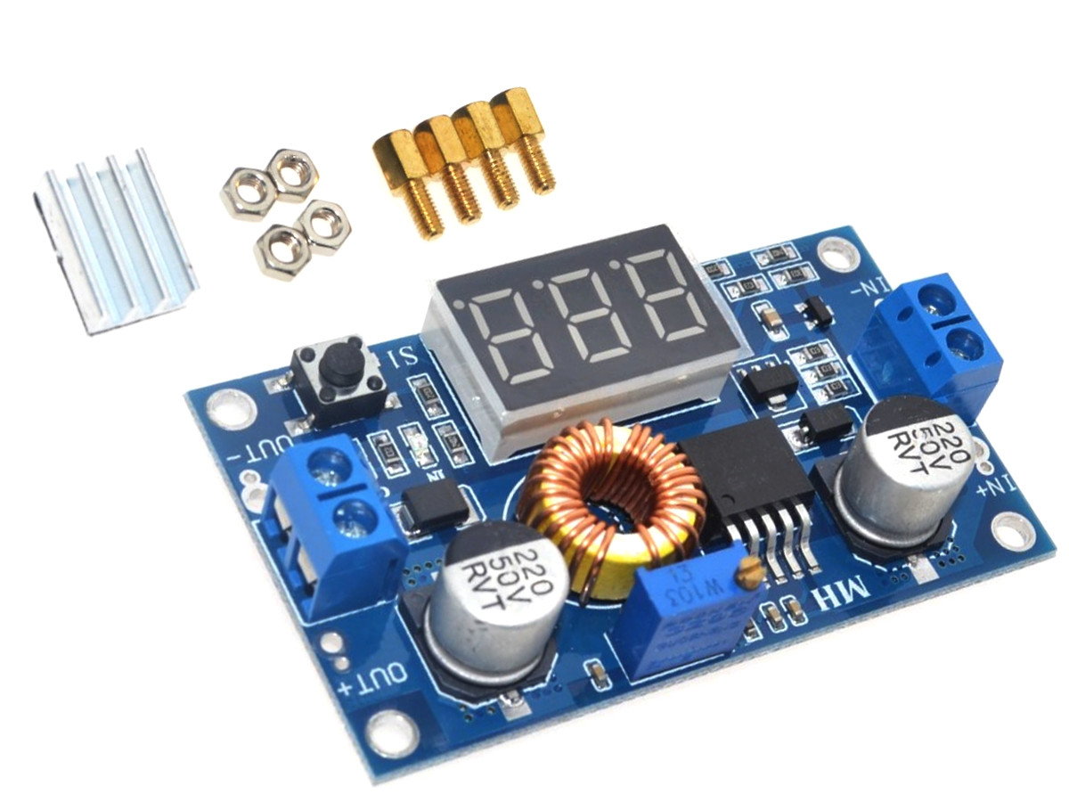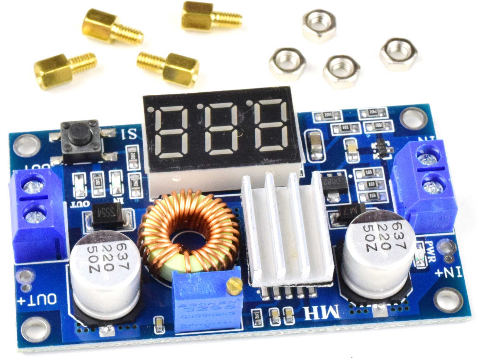 This module comes ready assembled and tested, with additional hardware (4 brass standoffs, heat sink). It is a powerful switching voltage regulator with very high efficiency of up to 96%.