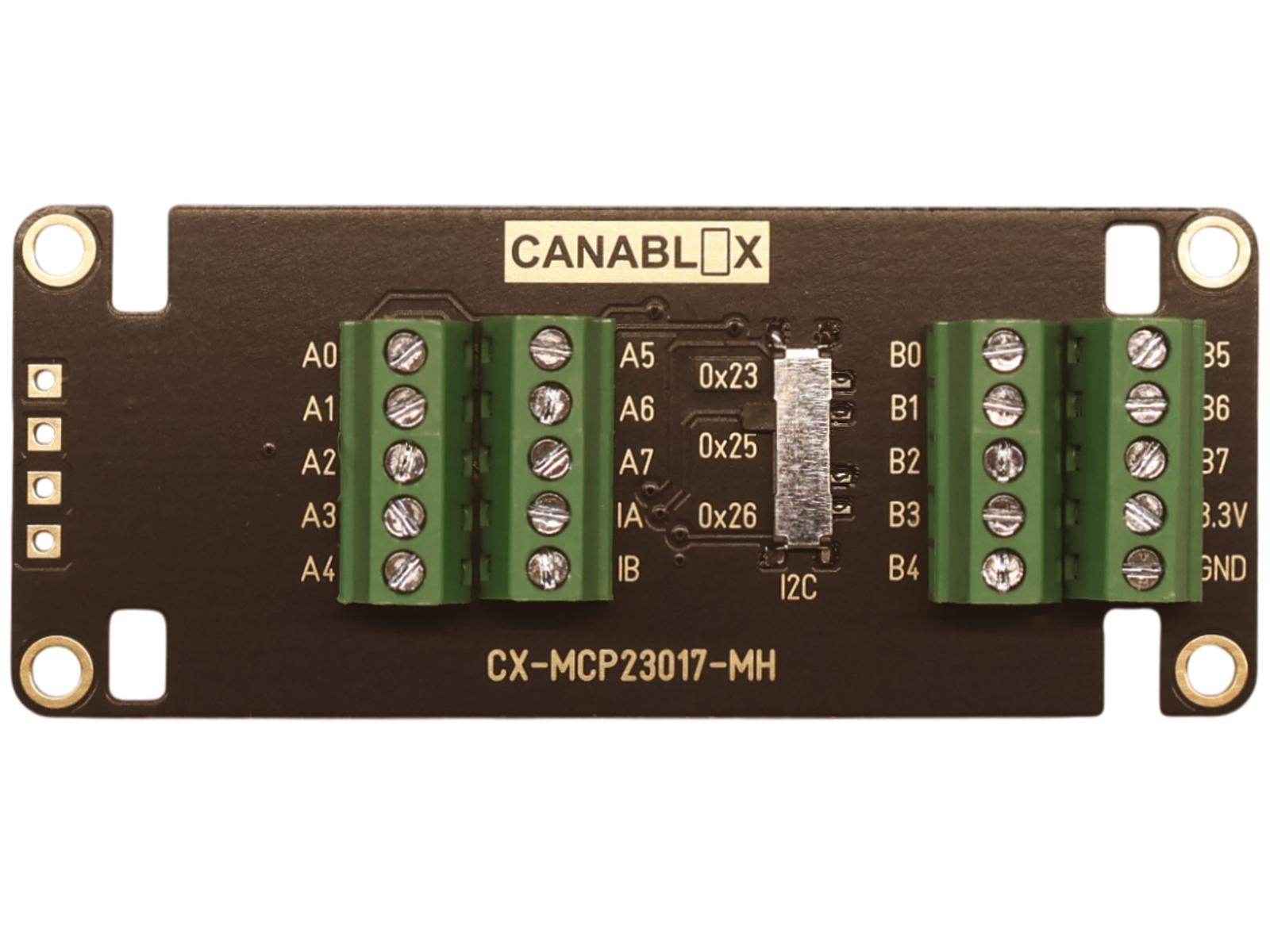 The CANABLOX® 16-Channel GPIO Expander CX-MCP23017-MH provides 16 general I/O digital ports. Each pin can be configured individually as input or output. Outputs can sink up to 25 mA and source up to 25 mA per pin (limited by package power dissipation). Inputs include integrated weak 100k pull-up resistors that can be enabled in software, eliminating the need for external resistors in many cases. It also features interrupt-on-change for inputs (accessible through screw terminals), and supports up to 3 devices on the same bus thanks to its selectable I2C address. The module is available in CANABLOX® "MH" form factor (2x1 Slot).